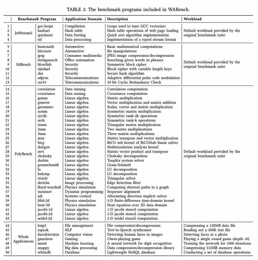 下表是论文作者研究构建的 WABench 基准套件中包含的基准程序。