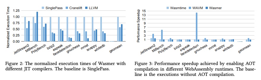 WebAssembly ⼆进制⽂件依赖 Web 浏览器的 JavaScript 引擎来执⾏,需要独⽴的 WebAssembly 运⾏时才能在⾮ Web 浏览器中运⾏ WebAssembly 代码。美国佐治亚大学的论文《How Far We’ve Come – A Characterization Study of Standalone WebAssembly Runtimes》构建了一个标准的 WABench 的基准套件,对独立的 WebAssembly 运行时进行了全面的表征研究,包含性能、内存开销和架构特征。分析了33 个独⽴ WebAssembly 运⾏时的TOP5,发现这些独立运⾏时在运⾏ WebAssembly ⼆进制⽂件时平均会降低 1.59 到 9.57 倍的性能。