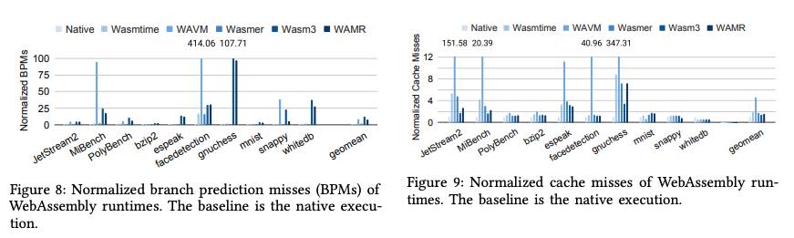 2.03x‒ 14.61x,⽽且还表现出⽐原生执⾏更⾼的每周期指令(Instructions per cycle, 即 IPC)值。 - WebAssembly 运⾏时表现出⽐原生执⾏更多的分⽀预测未命中率,范围从