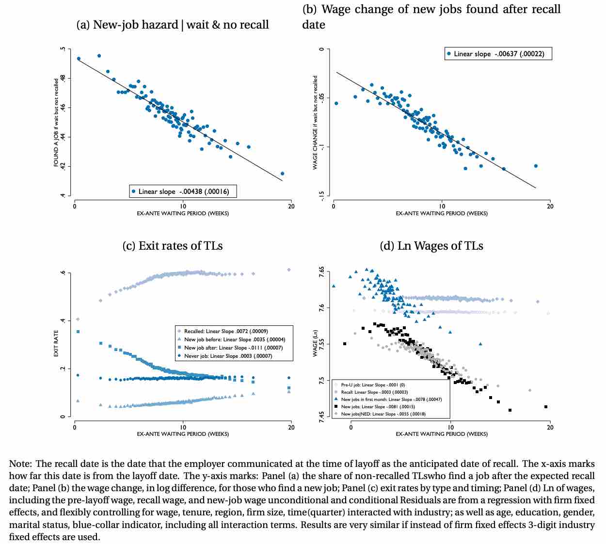 在失业期间,当召回可能性下降时,跳槽的⻛险和接受的新⼯作⼯资下降,⽆论是在召回⽇期还是在召回前同事之后。