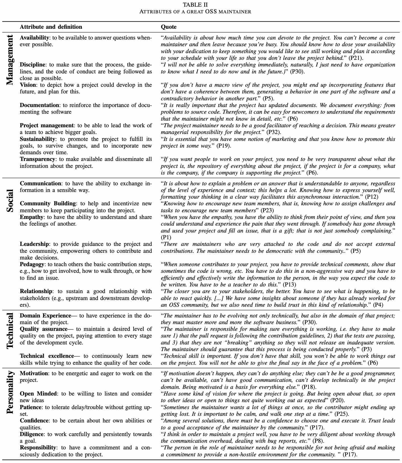 Google Go 工程师辞去工作转行成为全职开源维护者,同时为多个需要专业开源维护者的企业提供服务,报酬总额和 Google 工作相当。表明悄然兴起全职开源维护者薪酬竞争力完全不输职业软件工程师。美国瑙鲁大学和巴西联邦大学(UFPE、UNIFESP、UTFPR)的论文《What Makes a Great Maintainer of Open Source Projects?》 对 Linux、Debian 和 GitLab 经验丰富的维护人员进行了 33 次访谈,对 90 个 OSS(Open Source Software) 贡献者进行了评级调查。发现:沟通被认为是优秀维护者最重要的属性,其次是品质保障。